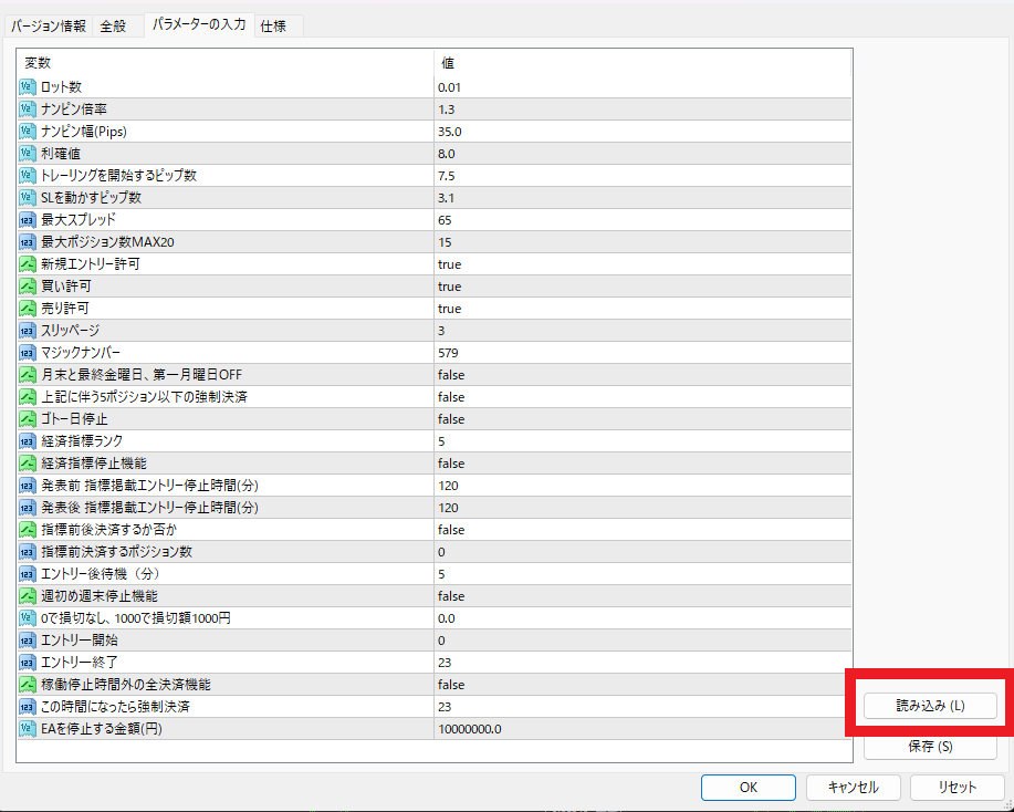 読み込みをクリックし、セットファイルをダブルクリックすれば、設定が変わります。