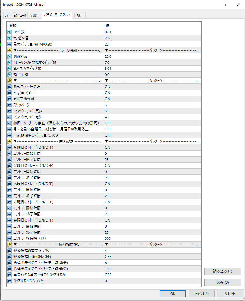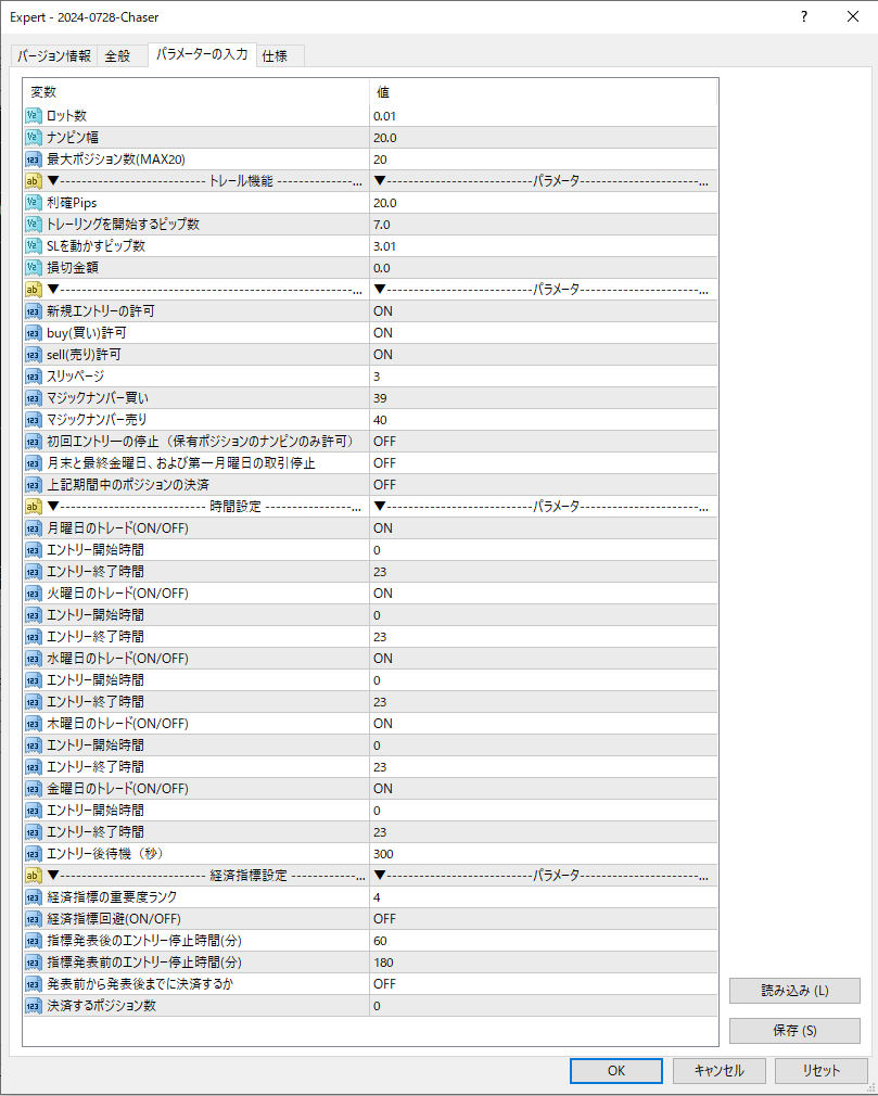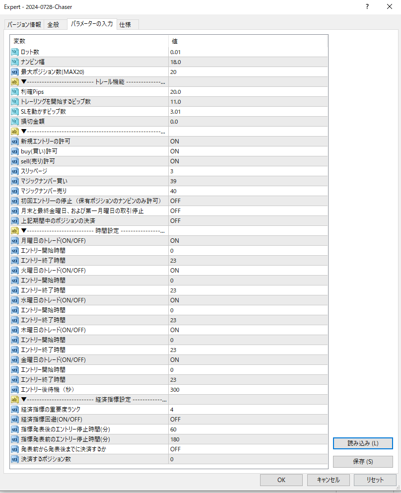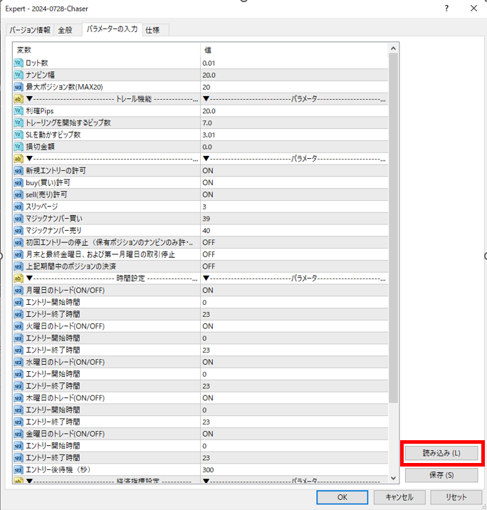 セットファイルは読み込むとパラメーター設定が一瞬でお勧めに変えられるので便利です。